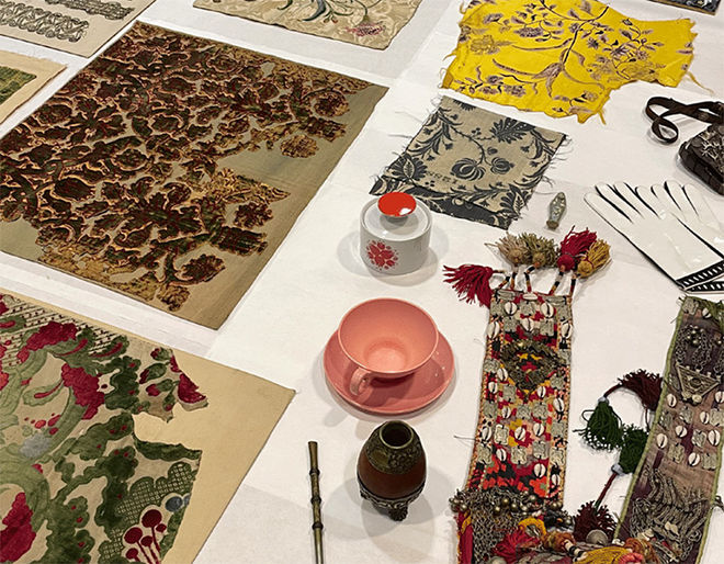 The Study Collection is managed by Barb Elam, who notes that “This fall, it is slated to be more active than in any prior semester.” Student educators working in Public Humanities + Research will use objects from the Study Collection in their public Object Lab presentations, and professors leading courses including Approaches to the Object, Supple Solids: A Deep History of Soft Containers, Dress in Art History: A Field Seminar, and Curatorial Thinking: From Object to Exhibition have planned sessions that will, according to Elam, “engage students with Study Collection objects through examination, close looking, and touch.”