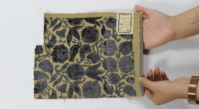 Cut pile silk velvet fragment from Parisian department store upholstery book, c. late 19th–early