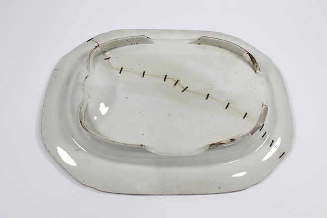 John Rogers & Son, Repaired Transferware Platter in "Camel" Pattern back, showing repair, 1843. BGC Study Collection, Gift of Lenore and Stephen Blank.