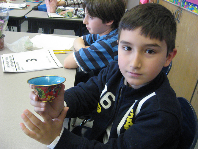 This winter, as part of an exciting outreach initiative, these and other fascinating questions are being explored by students in New York City schools together with Tracy Grosner, gallery outreach educator and BGC graduate student docents Alyssa Greenberg, Kimberly Vagner, Rebecca Mir, Ruthie Osborne, Sequoia Miller, Shahla Abdi, and Michelle Messer. The conversations are part of the BGC’s Suitcase Exhibitions Program that offers highlights of our Gallery exhibitions to K-12 students and educators and introduces school groups to the study of material culture. Two suitcase exhibitions, “Gifts from Our Ancestors: Native American Treasures,” and “Radiance of China” correspond to our current exhibitions Objects of Exchange: Social and Material Transformation on the Late Nineteenth-Century Northwest Coast, and Cloisonné: Chinese Enamels from the Yuan, Ming, and Qing Dynasties. Filled with intriguing objects such as: a Haida argillite carving, sweetgrass basket, cloisonné bowls, and a Chinese silk robe, each suitcase generates excited anticipation when we roll into the classroom. Students can’t wait to see what’s inside, to handle the objects, and speculate about what they see. Ultimately, outreach visits prepare teachers and students to have a richer and more meaningful experience when they visit the actual exhibitions, and they contribute to a greater understanding and appreciation for the history and meaning of material culture.