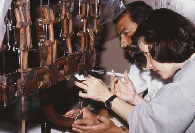Over the course of three decades, the conservation and study of the Gordion wooden objects was carried out by a team of more than 40 conservators, scientists, archaeologists, artists, and graduate student interns, including Michelle Hargrave and Melanie Clifton-Harvey from the BGC. New storage cabinets were built in the US and shipped to the Ankara Museum for safe storage of the furniture and other objects, and special display cases were installed in the Phrygian galleries of the museum to hold some of the most important of the Gordion wooden artifacts. Now on exhibition are the fancy inlaid table and two inlaid serving stands from Tumulus MM—reconstructed on Plexiglas mounts—as well as an inlaid stool, plates, bowls, the parasol, and the small animals from Tumulus P. These and other objects from Tumulus P, a serving stand and plates from Tumulus W, and the carbonized furniture fragments from the city mound are the subject of Simpson’s volume now in progress.
