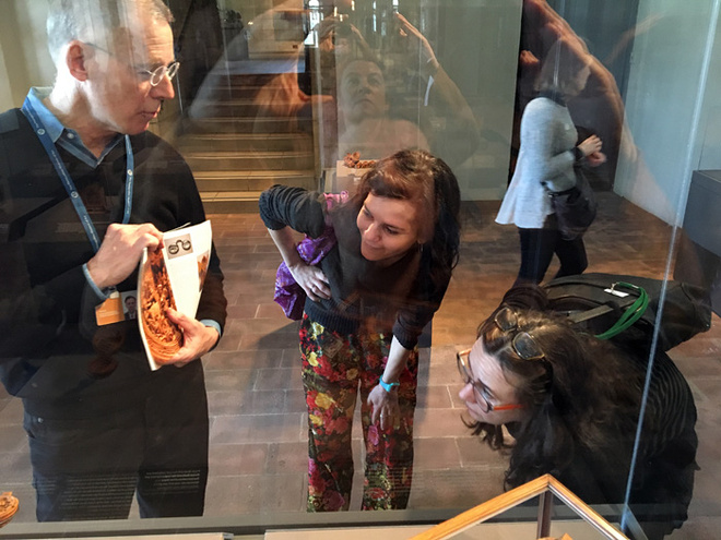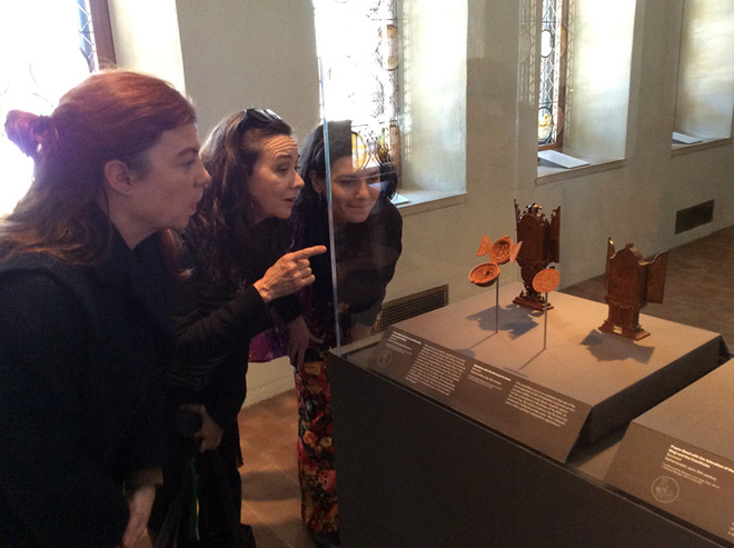 Students in Professor Ittai Weinryb’s Material and Materiality course are tackling questions of tangibility, ritual, process, technique, and reception in Medieval culture. Recently, they visited The Met Cloisters to view the exhibition of miniscule carved wooden prayer beads, Small Wonders: Gothic Boxwood Miniatures, where they admired the display of unique “prayer nuts,” handheld spheres carved from boxwood with intricate biblical scenes. Object Conservator Pete Dandridge introduced the elegant display and led a discussion about related objects in the permanent collection. As described in the exhibition catalog, microscopes, CT scans, and extensive study from curators and conservators at the Met and the Art Gallery of Ontario reveal much about how the wonderful objects were made