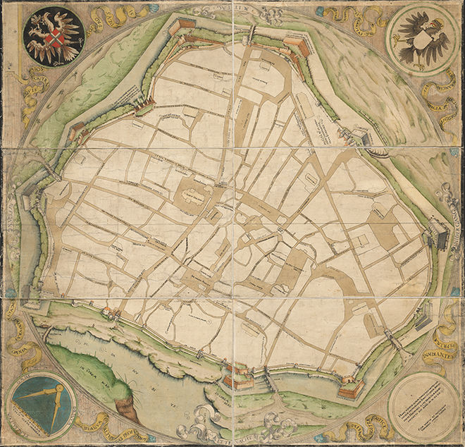 Augustin Hirschvogel, Map of Vienna, 1552. Etching with hand-coloring on laid paper, 81.9 x 85.4 cm. National Gallery of Art, Rosenwald Collection, 1954.12.71.