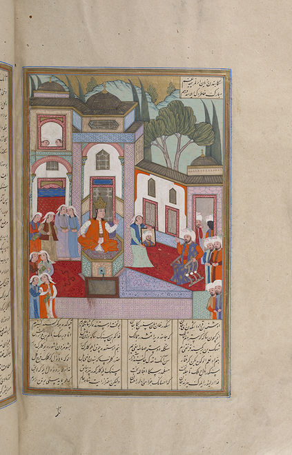 Kaydafe confronts Alexander with his portrait, from Tercüme-i Şehname (translation of Ferdowsi’s Shahnama) by Sharif Amidi (fl. 1500–1), calligraphy by Dervish Abdi, ca 1616–20. New York Public Library, Spencer Collection Turk. Ms. 1. New York Public Library Digital Collections.